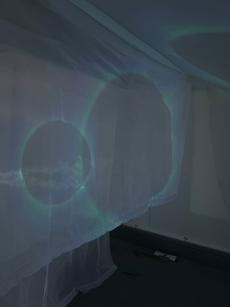 The Installations seek to bridge the gap between the spiritual world and physical world, using of layered fabric, projection and coloured glass to create immersive, contemplative spaces. Through abstraction, they explore ways in which we perceive and experience spirituality/ the divine.